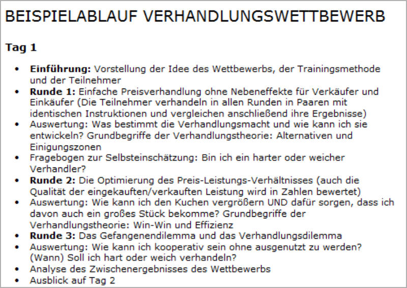 Testen Sie Ihre Verhandlungskompetenz oder die Ihrer Mitarbeiter mit dem Top-Ten-Negotiator-Verhandlungswettbewerb!Wie funktioniert der Verhandlungswettbewerb?Die Teilnehmenden bekommen in mehreren Runden die Aufgabe, vorgegebene Verhandlungs-Fallstudien/Rollenspiele (fachfremd oder aus ihrer Praxis) so durchzuführen, dass sie dabei eine möglichst hohe Punktzahl bekommen. Die Punktzahl reflektiert alle wesentlichen Aspekte der jeweiligen Verhandlung („Scoreable Negotiation Analysis“). Die Punktzahl kann mit derjenigen von Teilnehmenden mit identischen Instruktionen verglichen werden, so dass erkennbar ist, ob der entsprechende Wert ober- oder unterhalb von 100% des Durchschnittsergebnisses liegt. Über mehrere Runden kann ein Gesamtergebnis ermittelt werden.Wie kann ich bzw. können meine Mitarbeiter am Verhandlungswettbewerb teilnehmen?1. Die Testvariante: Sie können kostenlos durch eine formlose Anmeldung an rt@verhandlungstraining.biz an einer Testvariante in drei Runden teilnehmen, die online oder offline per E-Mail, Telefon oder in persönlichen Treffen mit Ihren Verhandlungspartnern durchgeführt werden.2. Die Inhouse-Variante: Sie können Ihren eigenen Verhandlungswettbewerb in Ihrer Organisation durchführen. Ein auf Ihren Bedarf abgestimmtes Angebot wird Ihnen gerne nach einem telefonischen Vorgespräch unterbereitet.Was bedeutet die „mittelharte“ Variante?Das Format des Verhandlungswettbewerbs hat sich in der Praxis besonders in der sogenannten „mittelharten“ Variante bewährt. Die „mittelharte“ Varianter ist „weicher“ als ein Assessment-Center, bei dem es um die reine Leistungsdiagnostik geht und „härter“ als ein reines Training, bei dem die Ergebnisse weniger wichtig sind. Die Teilnehmenden werden ermutigt, die Ergebnisse gleichzeitig locker und ernst zu nehmen: locker insofern als sie Dinge riskieren und testen sollen, die sie in der Praxis nicht wagen würden und schlechte Ergebnisse unproblematisch oder sogar zu Lernzwecken erwünscht sein können; ernst insofern als sie mit sportlichem Ehrgeiz versuchen dürfen, den Wettbewerb zu gewinnen. Es gibt in diesem Format immer die (nicht überprüfbare) gute Ausrede für schlechte Ergebnisse, experimentiert zu haben. In der „mittelharten“ Variante können außerdem schwächere Ergebnisse nur abhängig vom Wunsch der Betroffenen analysiert werden.Selbstverständlich ist auf Wunsch auch die Durchführung des Wettbewerbs in einer härteren oder weicheren Variante oder in anderen Variationen möglich.Einen Erfahrungsbericht über einen Verhandlungswettbewerb finden Sie auf der Website von People2Move ...Ein Beispiel für einen möglichen Ablauf des Verhandlungswettbewerbs finden Sie hier ...
